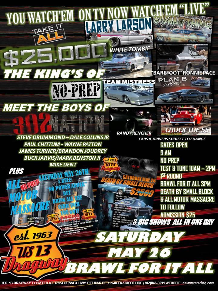 In just two weeks, The Kings of No Prep and popular TV show Street Outlaws No Prep Kings will be here at the U.S. 13 Dragway to challenge 8 local teams in our first ever NO PREP NATIONALS "BRAWL FOR IT ALL!"